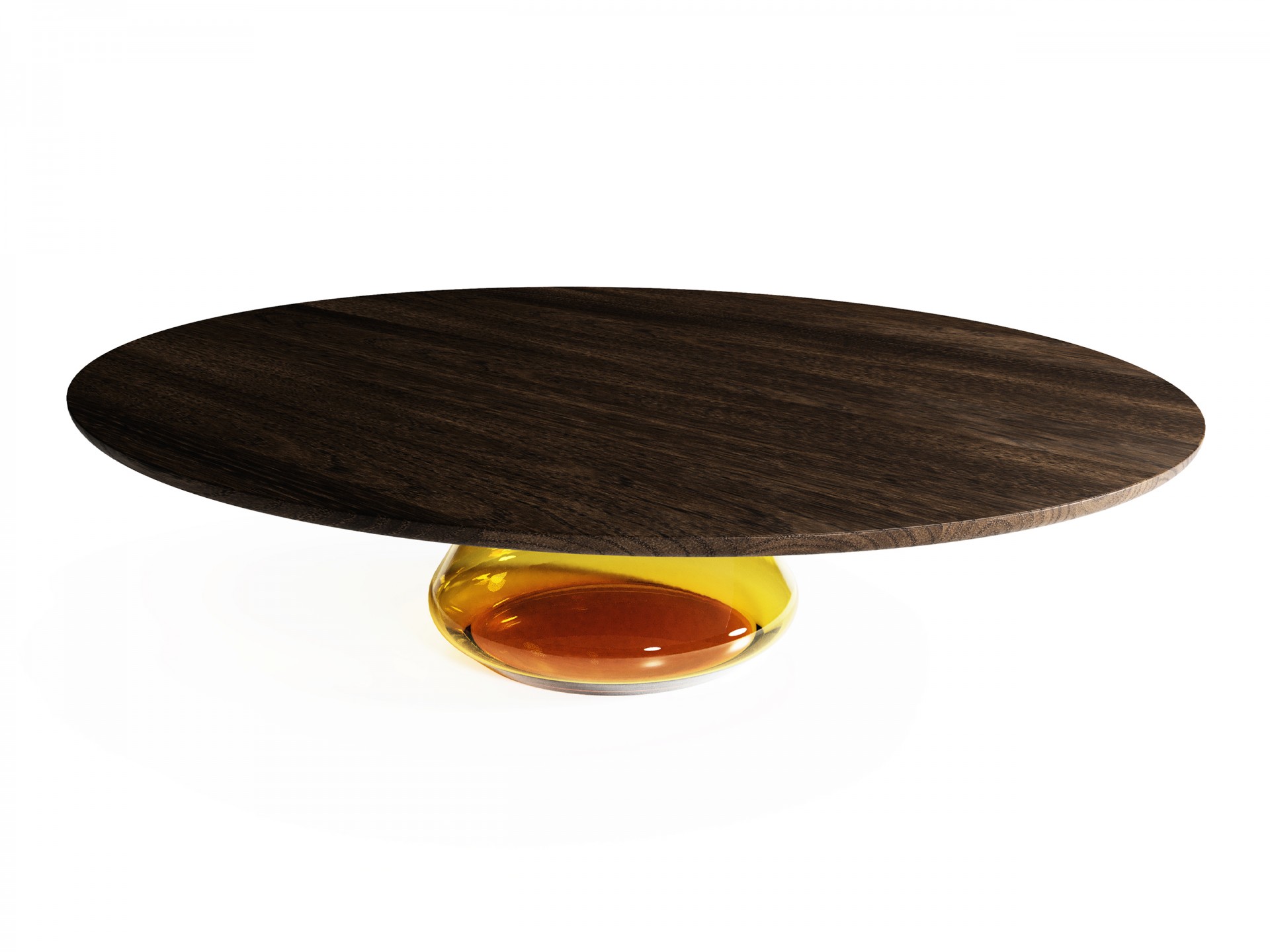 Contemporary Center Coffee Table ft. hand-blown glass base and solid oiled oak top