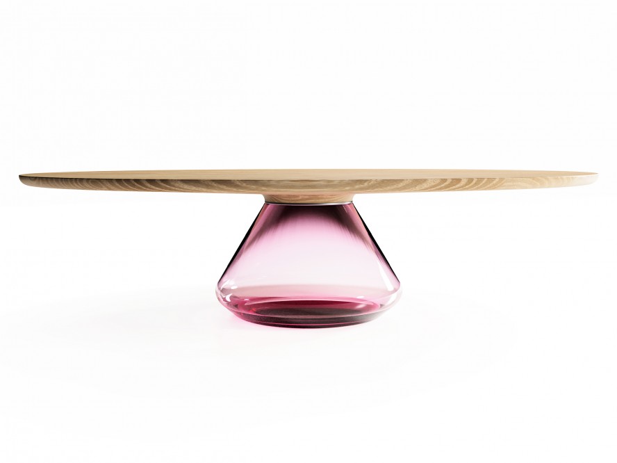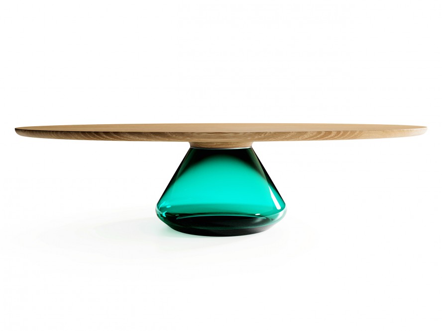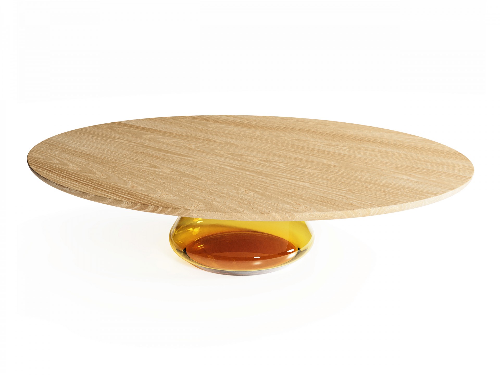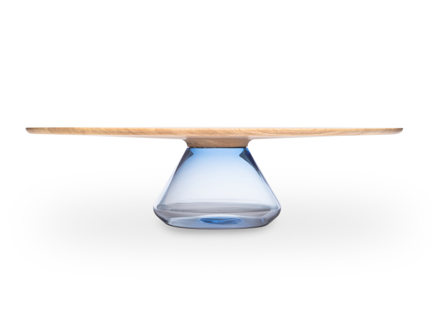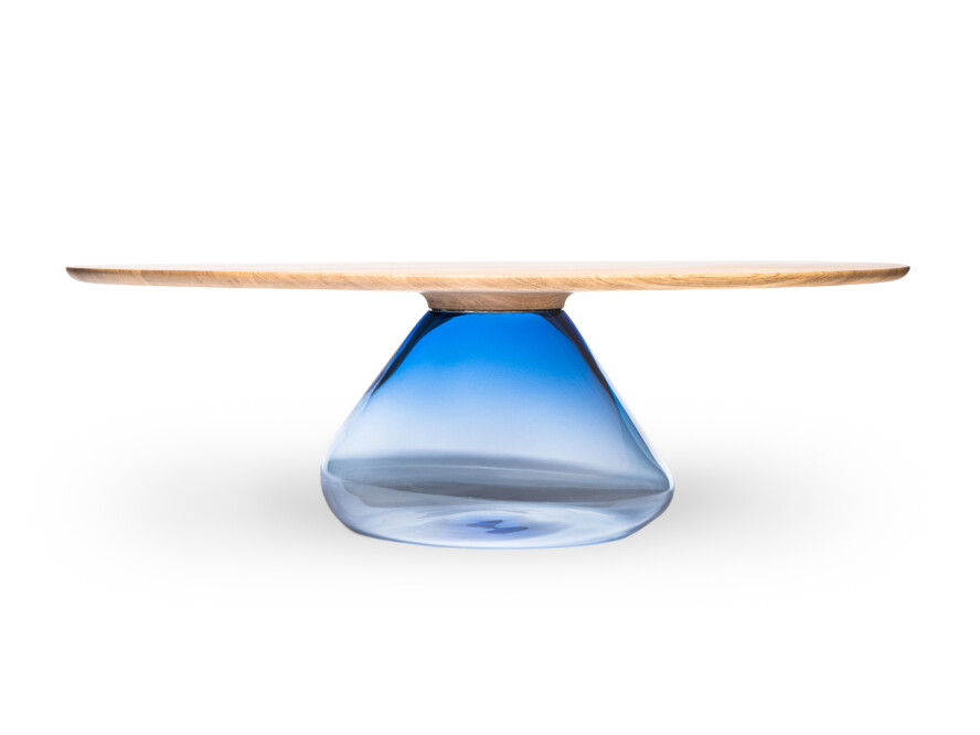 Contemporary Center Coffee Table ft. hand-blown glass base and solid oiled oak top