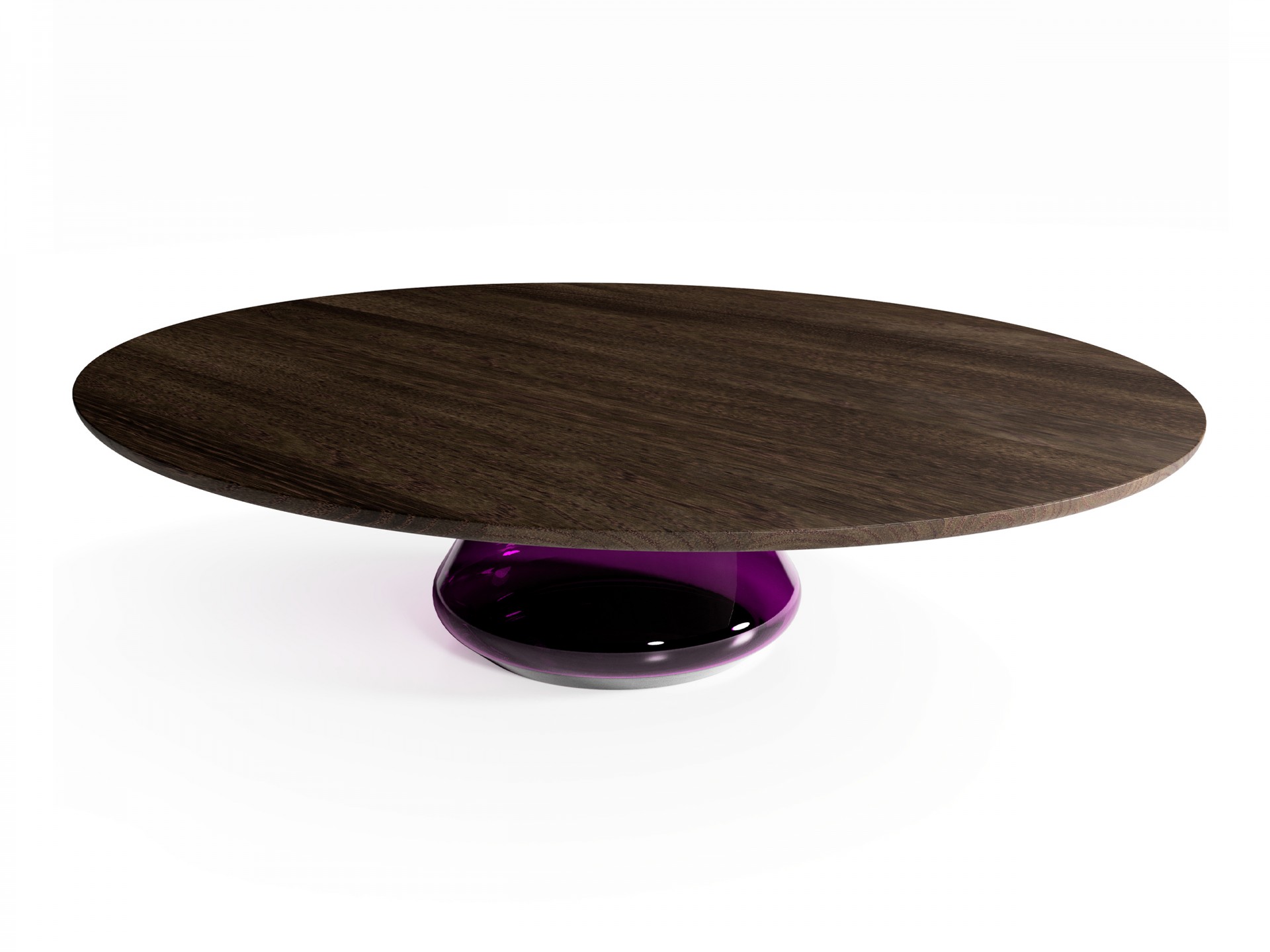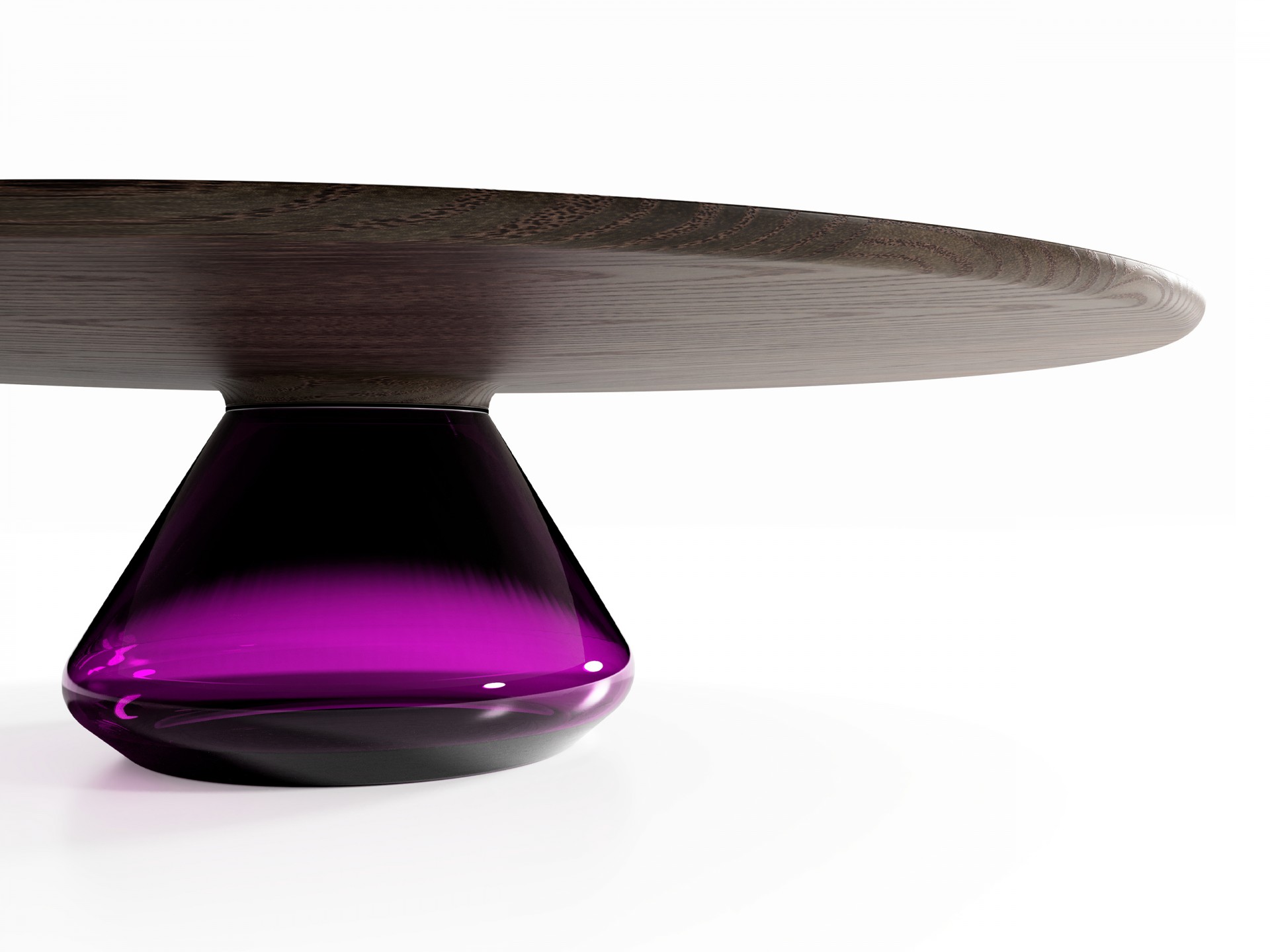 Contemporary Center Coffee Table ft. hand-blown glass base and solid oiled oak top