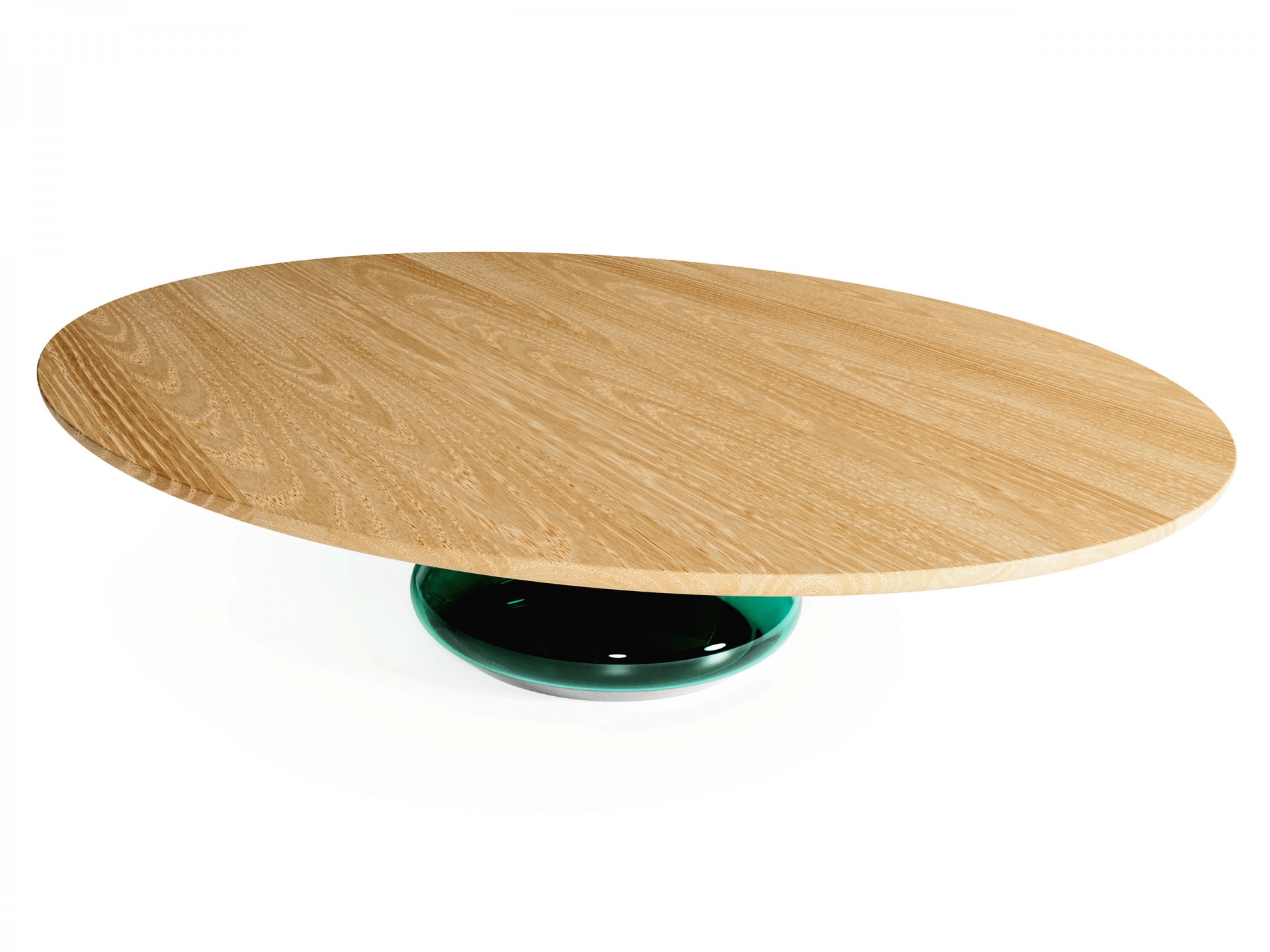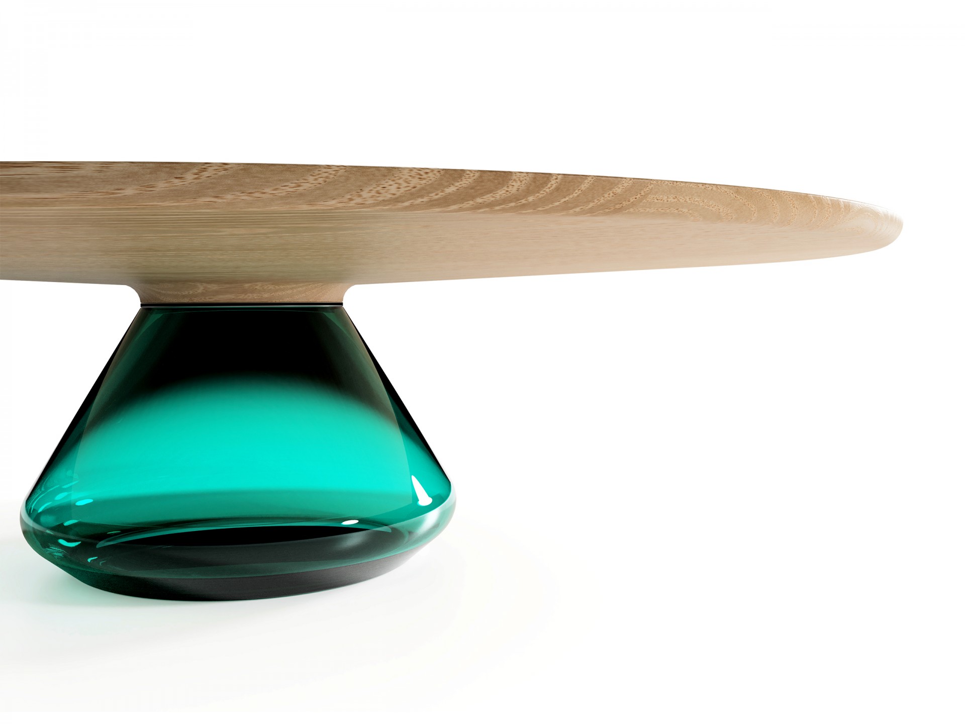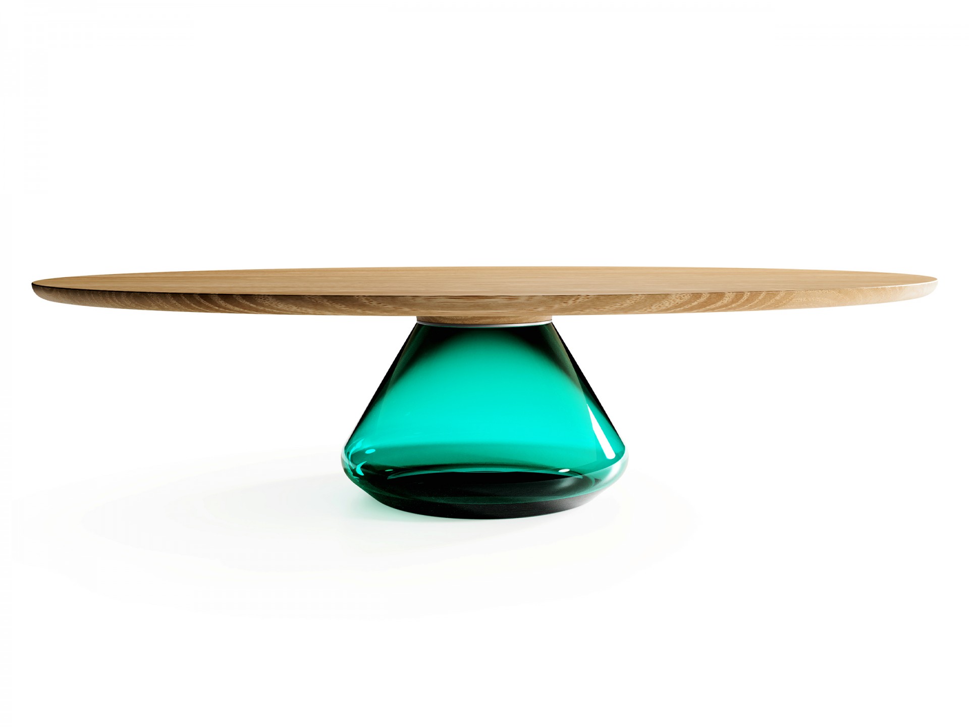 Contemporary Center Coffee Table ft. hand-blown glass base and solid oiled oak top