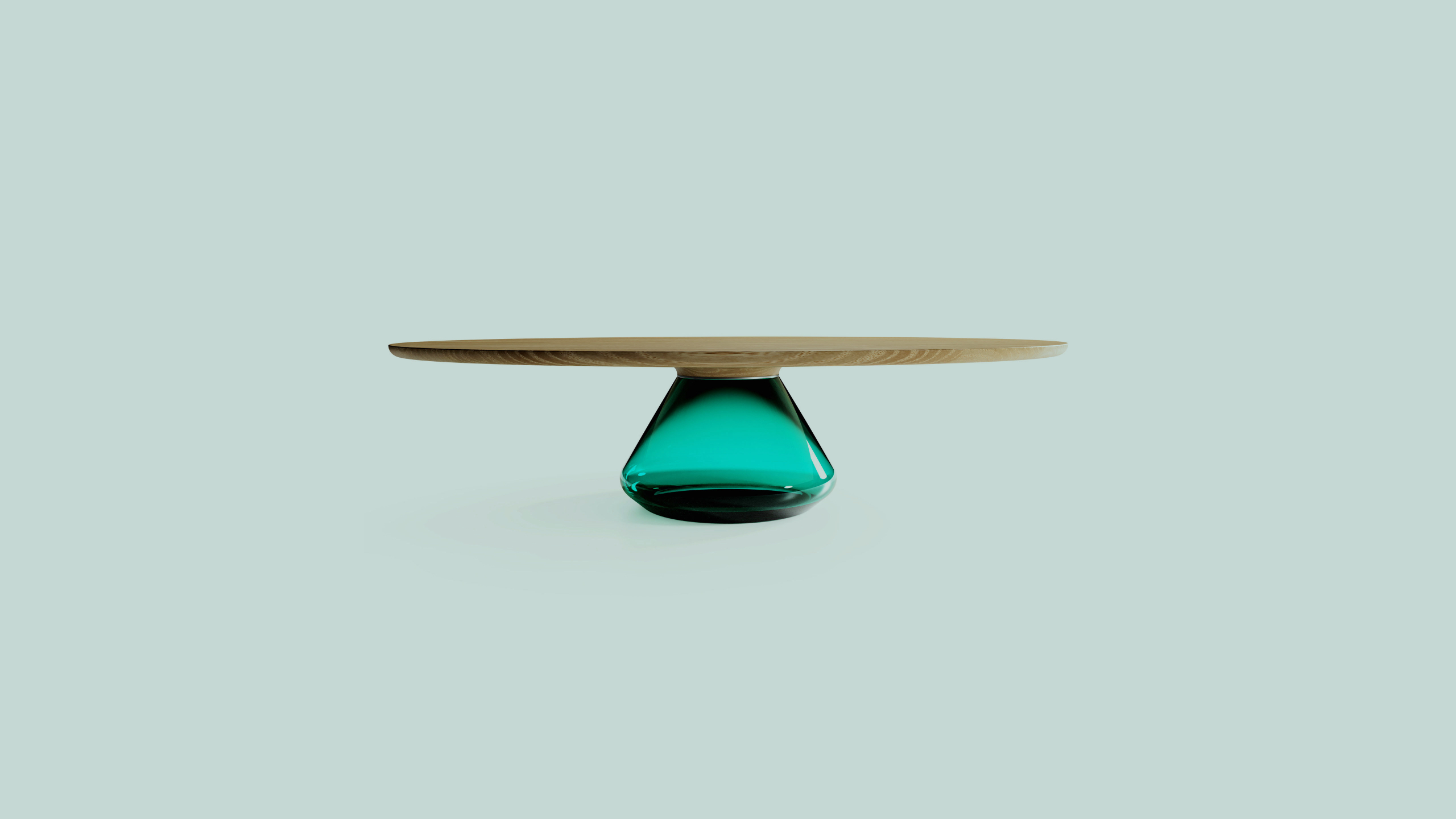 Solid and beautiful oaken top hold up by glamorous handmade glass base. After joining together, the exclusive and elegant coffee table came to light.