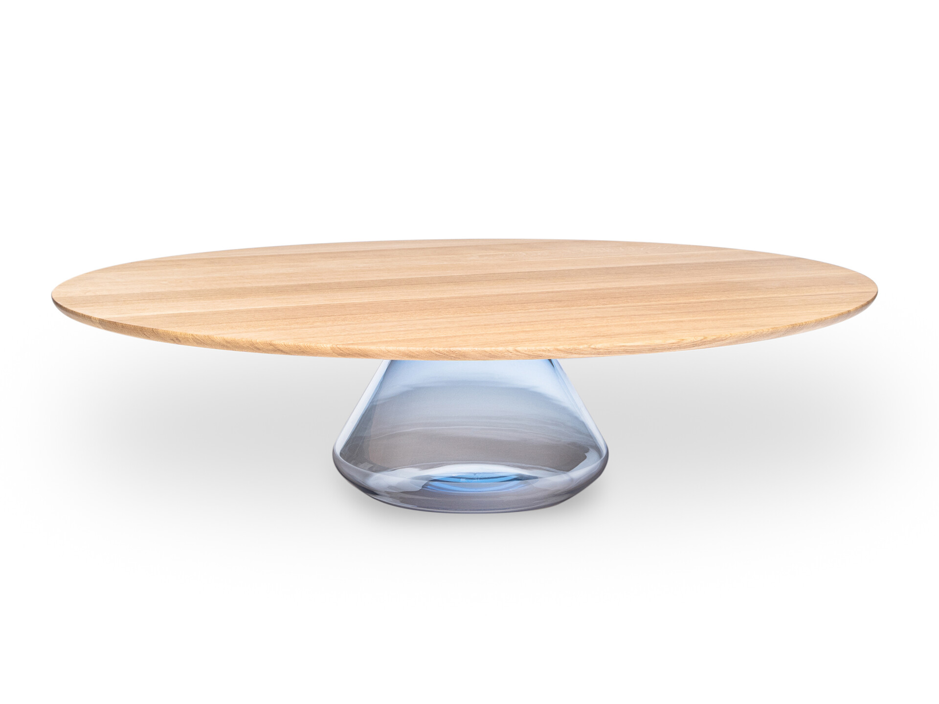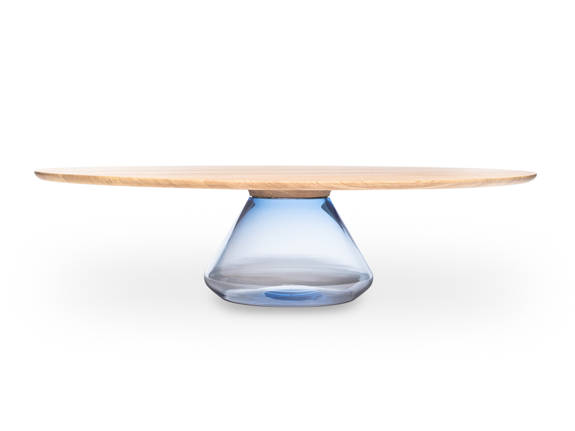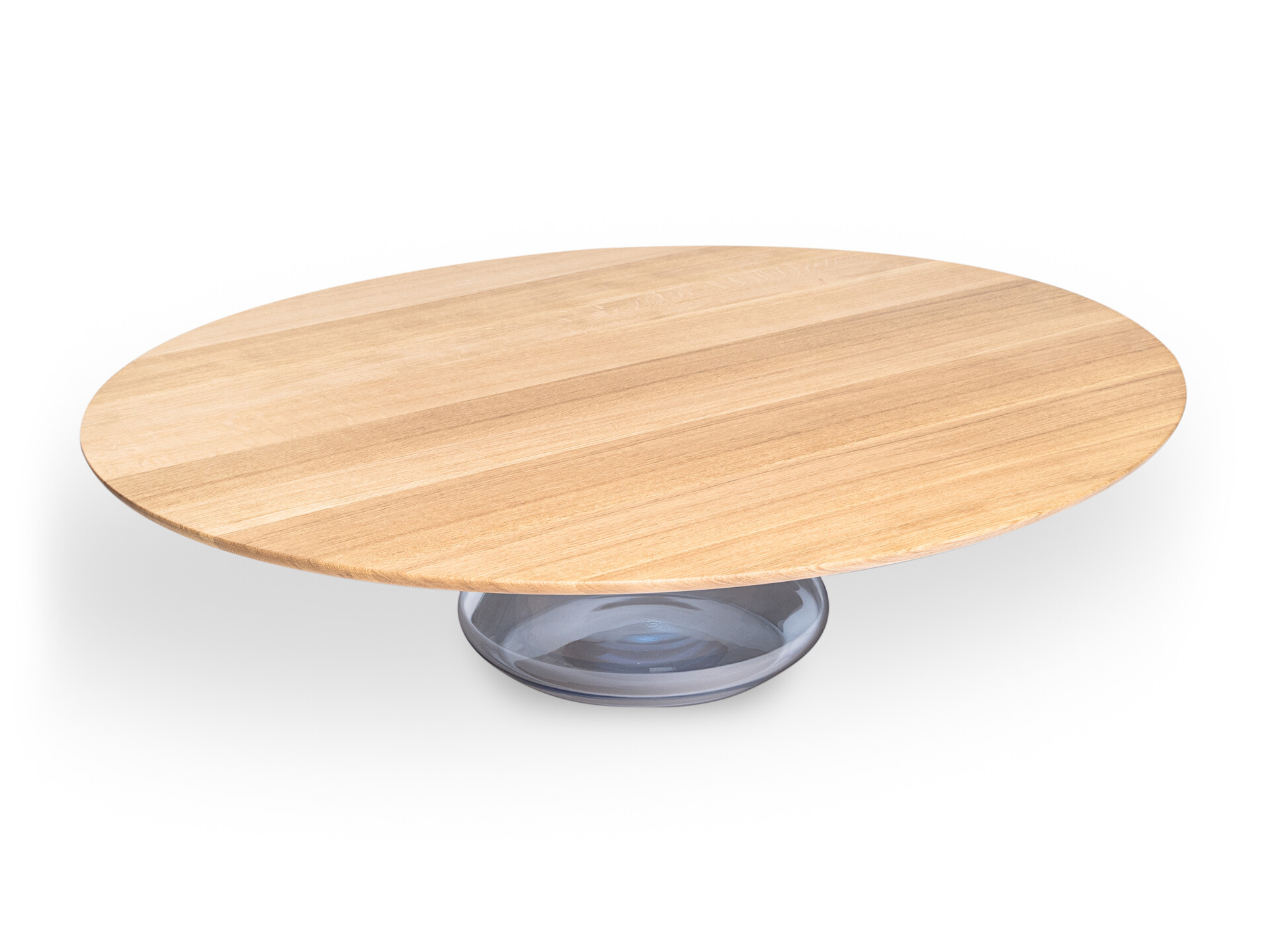Solid and beautiful oaken top hold up by glamorous handmade glass base. After joining together, the exclusive and elegant coffee table came to light.